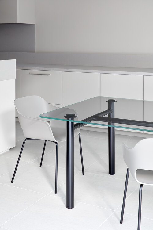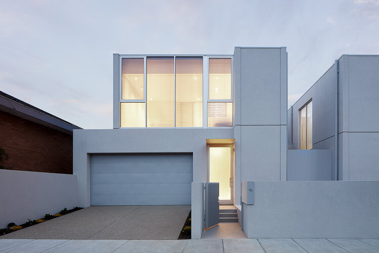 The JCR Residences feature two minimalist townhouses designed by Davidov Partners Architects. Floor length windows create bountiful natural lighting and grey tones throughout create a calming space for occupants. Working with a square spaced site, the architects created a compact plan emphasizing openness. Interior styling by Beckie Littler.
